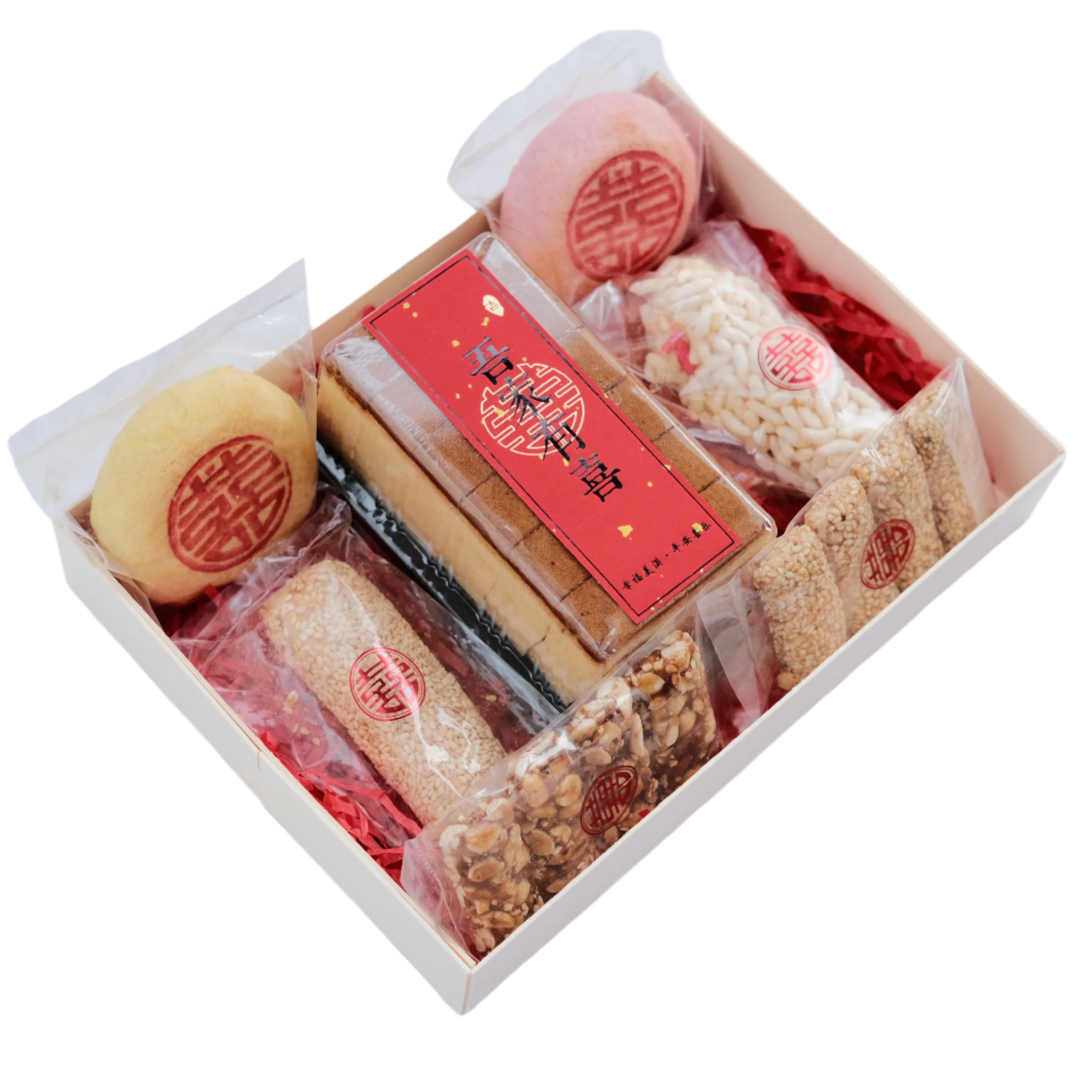 1 CAKE2 TRADITIONAL XI PASTRY - 75g1 LARGE SESAME PUFF 1 LARGE RICE PUFF 1 PACK PEANUT CANDY - 4 PCS 1 PACK SESAME CANDY - 4 PCS