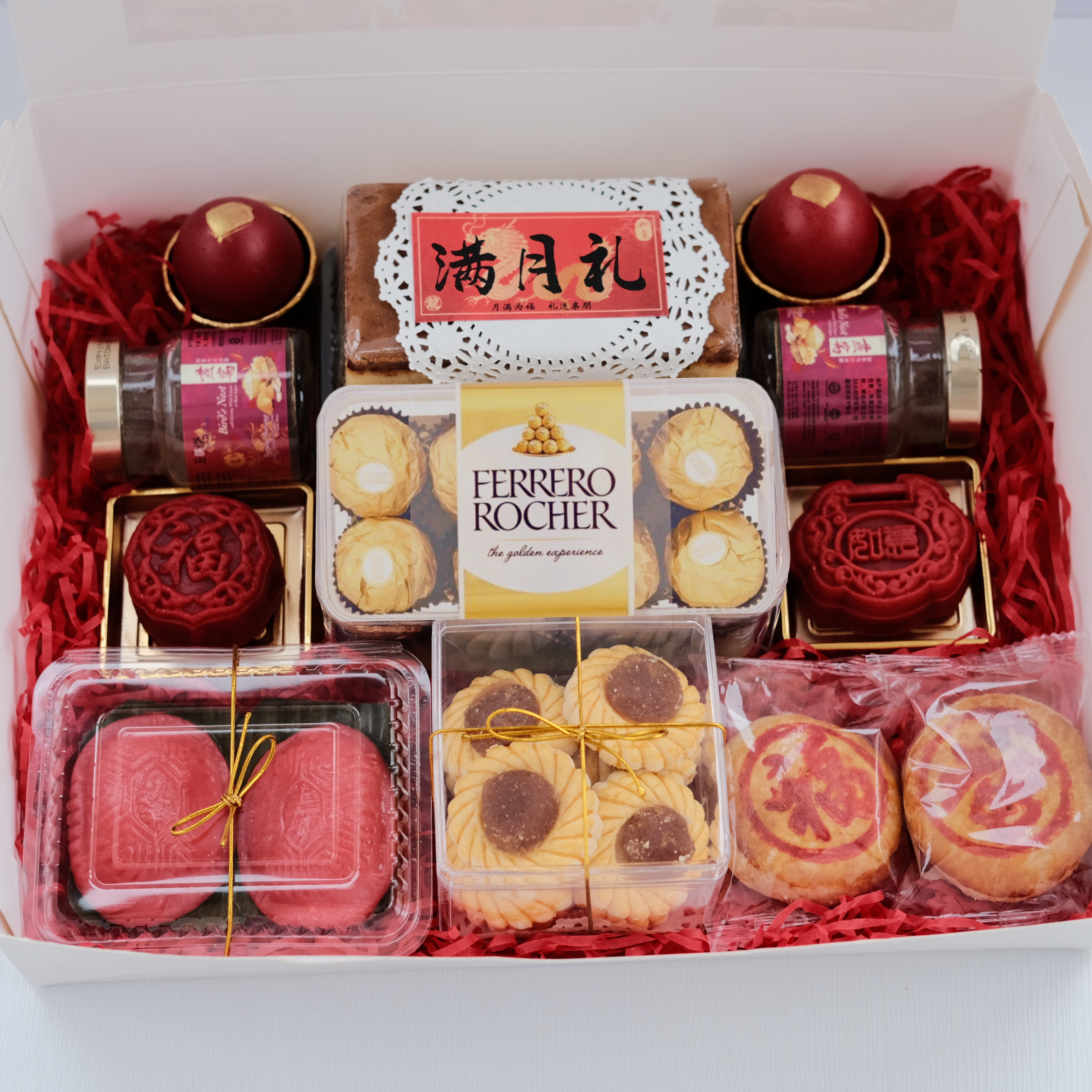 1 CAKE2 RED EGGS2 ANG KU KUIH2 DAOSA PASTRY2 INTRICATE LOCK PASTRY2 BIRDNEST1 BOX FERRERO ROCHER - 16 PCS1 BOX PINEAPPLE TARTS - 8 PCS
