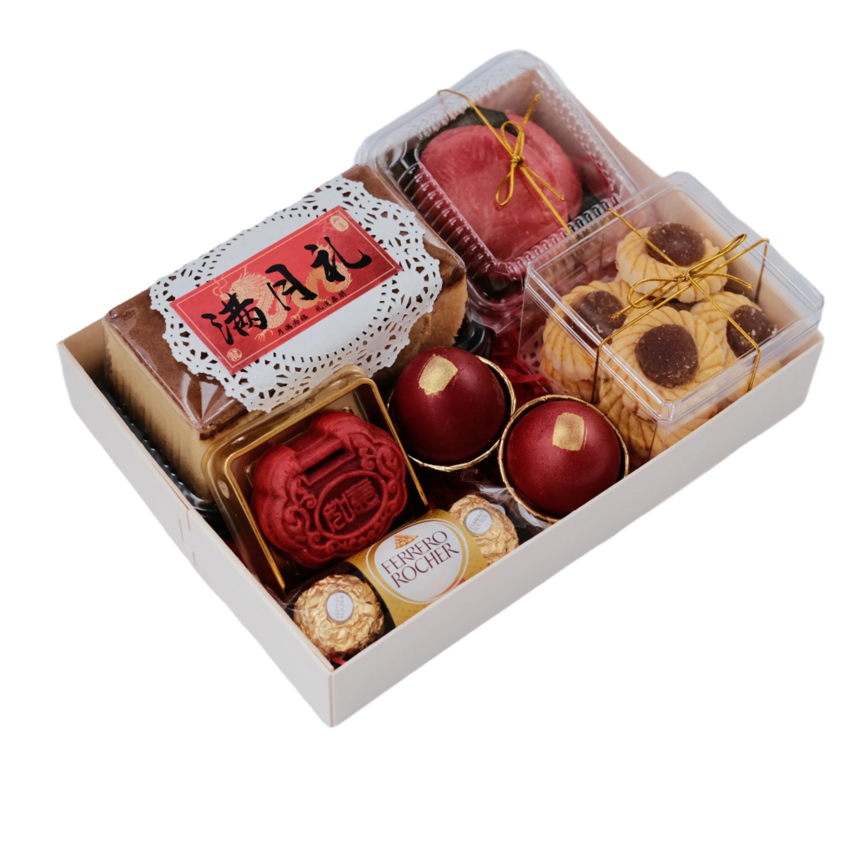 1 CAKE2 RED EGGS2 ANG KU KUIH1 INTRICATE LOCK PASTRY1 PACK FERRERO ROCHER - 3 PCS1 BOX PINEAPPLE TARTS - 8 PCS